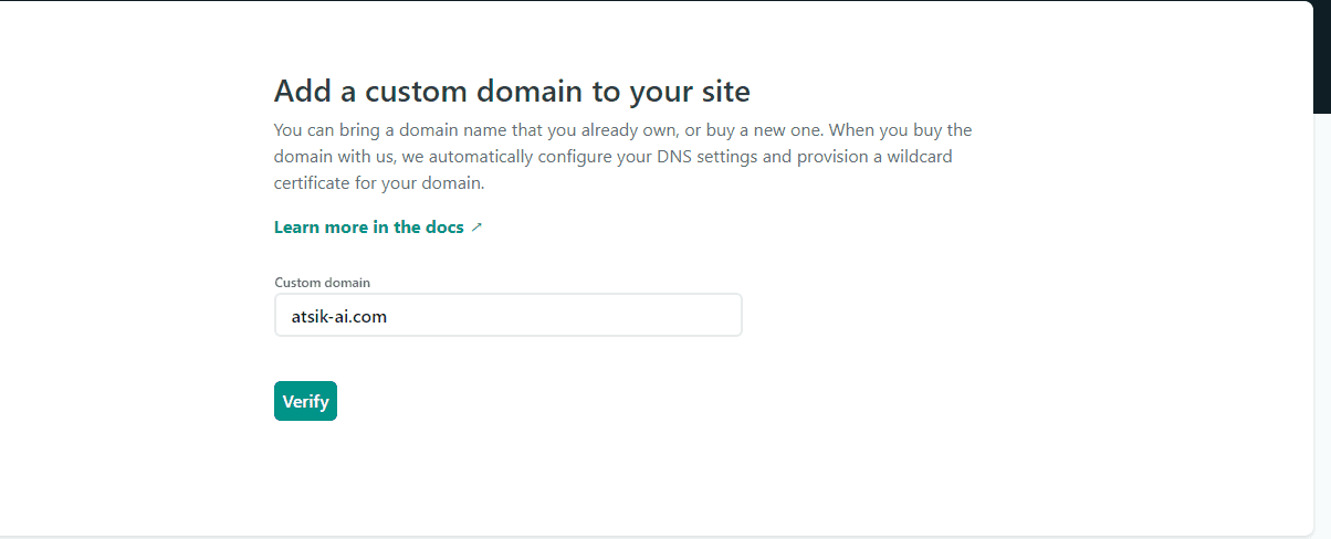 Add custom domainでドメインの追加画面に入れるので、取得したドメインを入力し